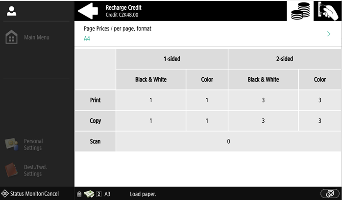 Bei aktivierter Guthabenabrechnung müssen die Nutzer über ein ausreichendes Guthaben auf ihrem Konto verfügen, um drucken, kopieren und scannen zu können. Auf dem Startbildschirm des integrierten Terminals können sie ihr verbleibendes Guthaben einsehen. Wenn das Guthaben aufladen Aktion auf dem Terminal verfügbar ist, können die Nutzer ihr Guthaben durch Eingabe eines Codes von einem Aufladegutschein direkt an einem beliebigen eingebetteten Terminal aufladen.