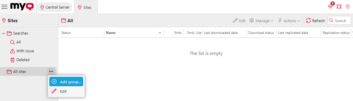 Sobald die Site-Server mit Ihrem Central-Server verbunden sind, können Sie sie über die Webschnittstelle des Central-Servers MyQ verwalten, in MyQ, Standorte.