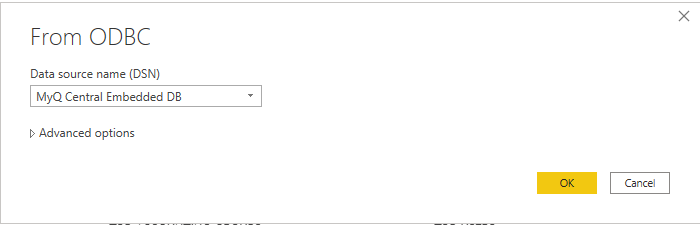 Für ODBC, klicken Sie auf Daten erhalten, Mehr.... Wählen Sie in dem neuen Fenster Andereklicken Sie auf ODBC auf der Liste, und klicken Sie auf Verbinden Sie. Wählen Sie in der neuen Eingabeaufforderung den Datenquellennamen (DSN), den Sie in der Anwendung ODBC-Datenquellen erstellt haben, und klicken Sie auf OK.