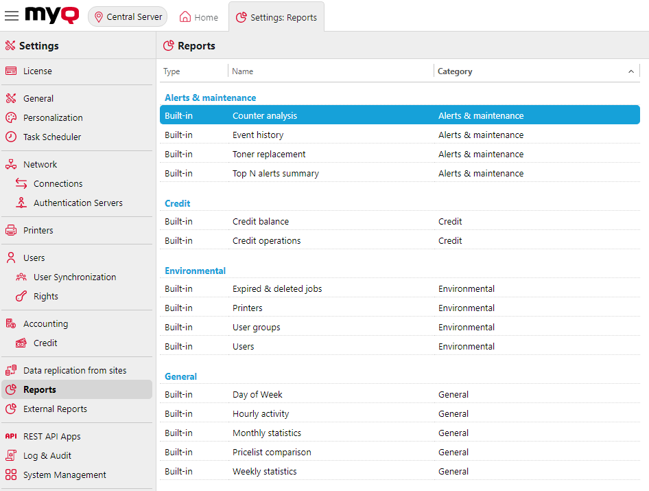 Wenn Sie Berichte über die Berichte Auf der Hauptregisterkarte können Sie aus einer großen Anzahl integrierter Berichtstypen wählen, die in mehrere Kategorien unterteilt sind. Einige der Typen sind in mehreren Kategorien enthalten (z.B., Gruppen: Tägliche Zusammenfassung, Druckaufträge: Tägliche Zusammenfassungusw.), während einige der Typen nur für eine Kategorie gelten (z. B., Gerätewarnungen in der Alarmverwaltung oder Guthaben in Kredit). Eine Übersicht über alle Berichtsarten finden Sie auf der Seite Berichte Registerkarte Einstellungen (in MyQ, Einstellungen, Berichte).