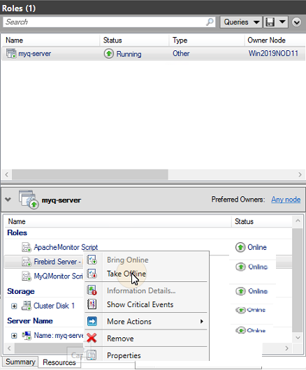 Um die Firebird Server - MasterInstanz Dienst offline, öffnen Sie den Failover Cluster Manager, gehen Sie zu Rollen klicken Sie mit der rechten Maustaste auf das Firebird Server - MasterInstanz Dienst, und klicken Sie auf Offline nehmen im Kontextmenü.