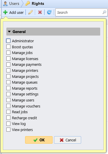 Um einen neuen Benutzer oder eine Gruppe von Benutzern zur Liste auf der Seite Rechte Registerkarte Einstellungen:
