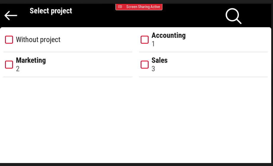 Nach dem Antippen von „Unlock Panel“ wird der Benutzer sofort zum Projekt-Auswahlbildschirm weitergeleitet, wo er ein Projekt (oder das Ohne Projekt option). Das Projekt wird dann allen Aufträgen zugewiesen.