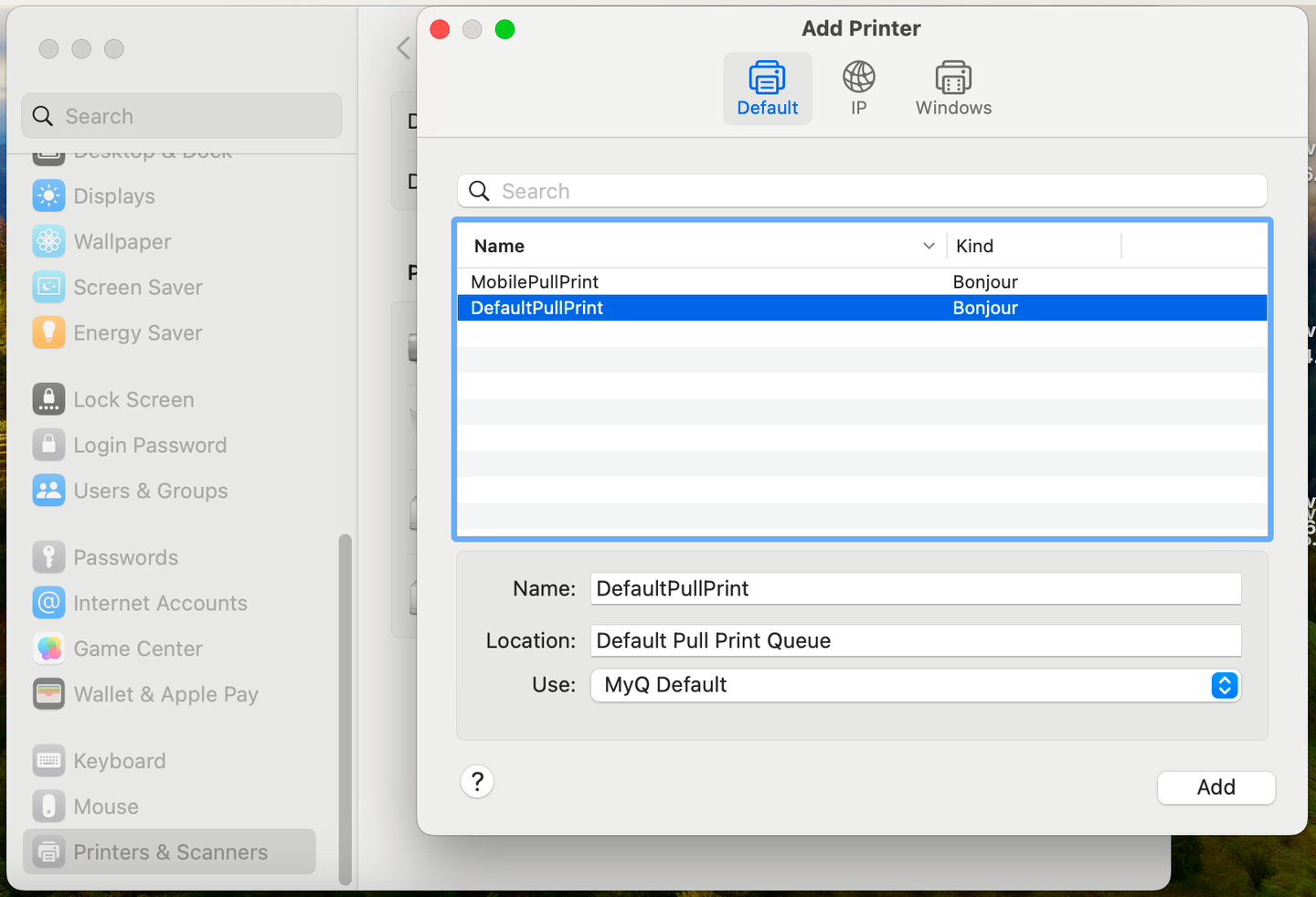 • default/queueName – Use this if you want to publish any existing MyQ print queue for macOS devices only. This endpoint does not use IPP authentication, instead, the logon user signed in to the system is used.
