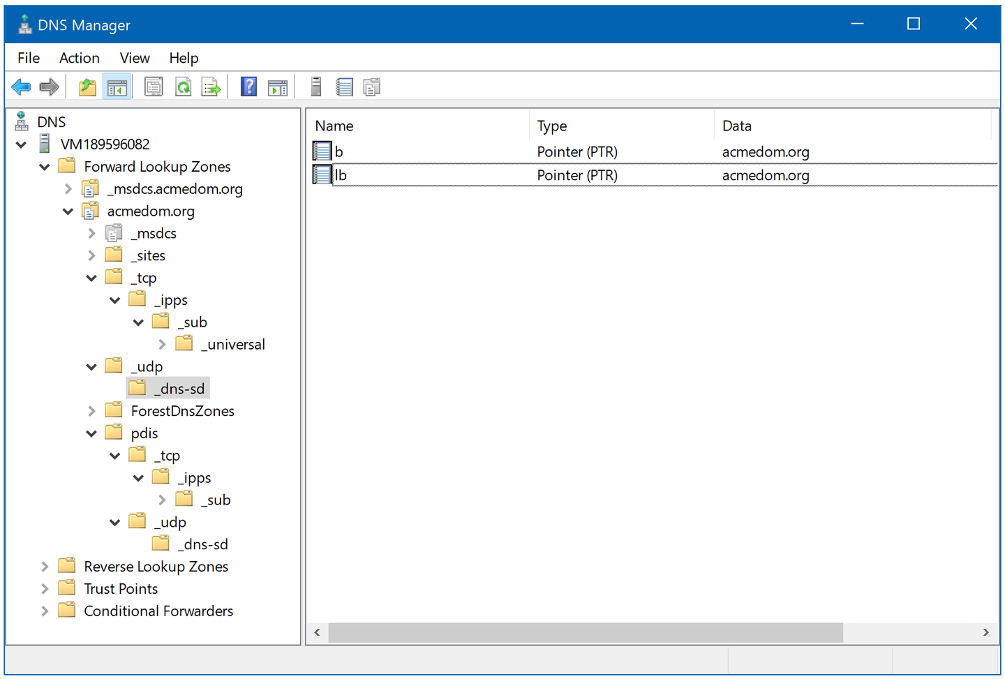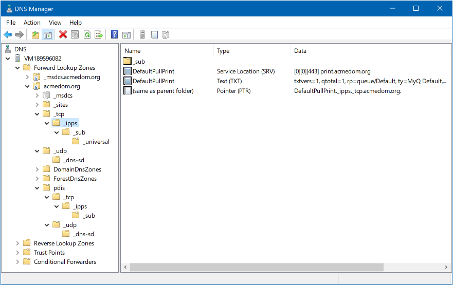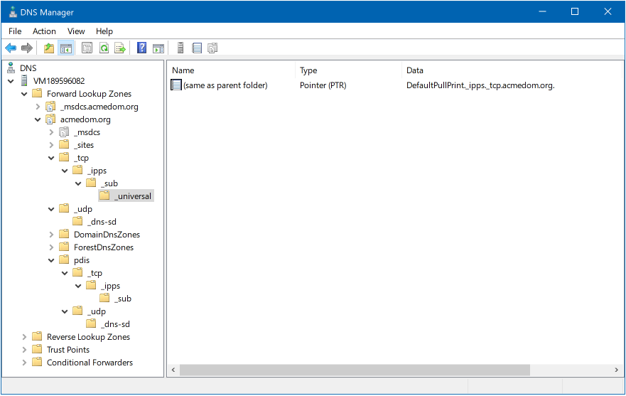 In the DNS Manager, expand the domain where you want to advertise AirPrint services (e.g., acmedom.org).