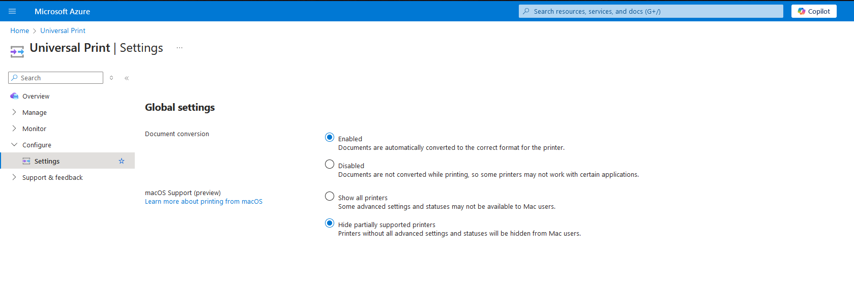 3. Go to Universal Print > Settings and enable Document Conversion.