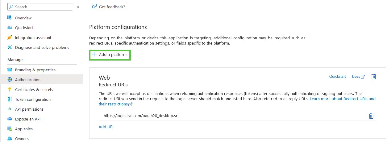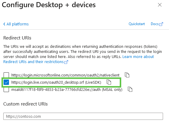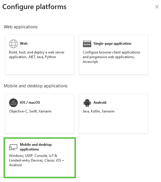 3. Redirect URI (optional) -  The authentication response is returned to this URI after successfully authenticating the user. Select the Public client/native (mobile&desktop) option from the drop-down.