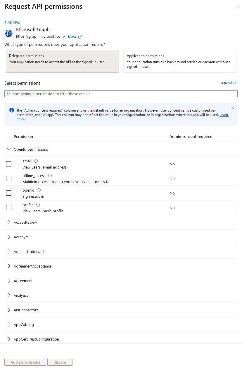 1. Select Microsoft Graph and add the permissions shown above. Click Add permissions to save.
