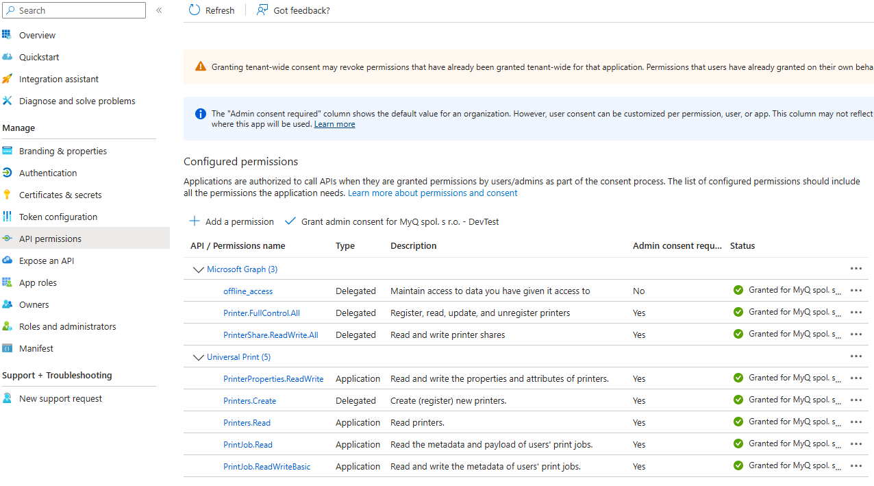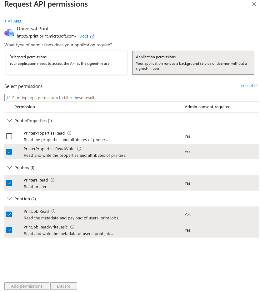 2. For Universal Print, click Add a permission and then select Universal Print. Add the permissions shown above and then click Add permissions.