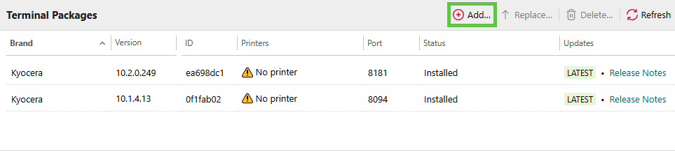 To do so, you first need to ensure both Terminal packages are uploaded in your Web User Interface, in MyQ>Settings>Printers and Terminals. Use the Add button in the Terminal Packages section at the bottom of this page. More details on this process are available here under the heading Terminal Packages.