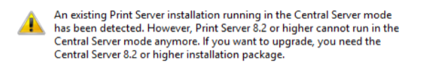 Since version 8.2, it is not possible to use the Print Server in the Central Server mode. The upgrade will not be permitted by the installer software if you are trying to upgrade this type of Central Server.