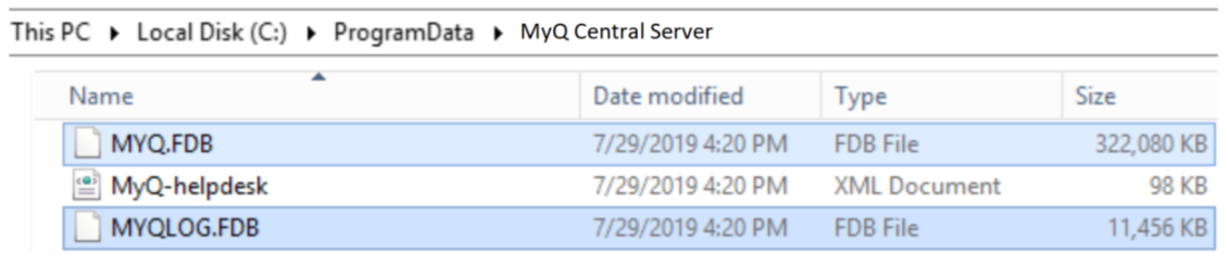 Files are named MYQ.fdb and MYQLOG.fdb.