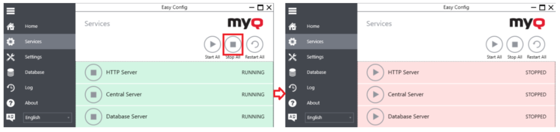 To manually stop services, use the Easy Config application and click on the Stop button in the Services tab.
