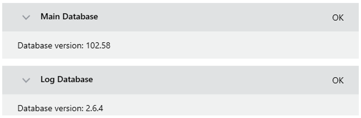 Then open the Database tab and submenus Main Database and Log Database – verify that the database status is OK for both the Main database and the Log database.