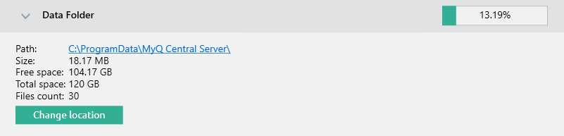Depending on the type of the database, the Data folder either does, or does not contain the MyQ database: the MyQ Embedded database is part of the folder, whereas the SQL database is stored on the SQL server. Besides the MyQ database, the folder contains additional files with data used by the MyQ system, such as reports, certificates or the config.ini file.