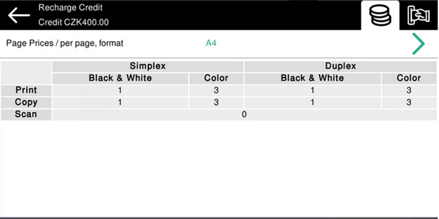 With credit accounting activated, users must have a sufficient amount of credit on their account to be allowed to print, copy and scan. On their home screen on the embedded terminal, they can view their remaining credit. If the Recharge Credit action is available on the terminal, users can recharge their credit by entering a code from a recharging voucher directly on any embedded terminal.