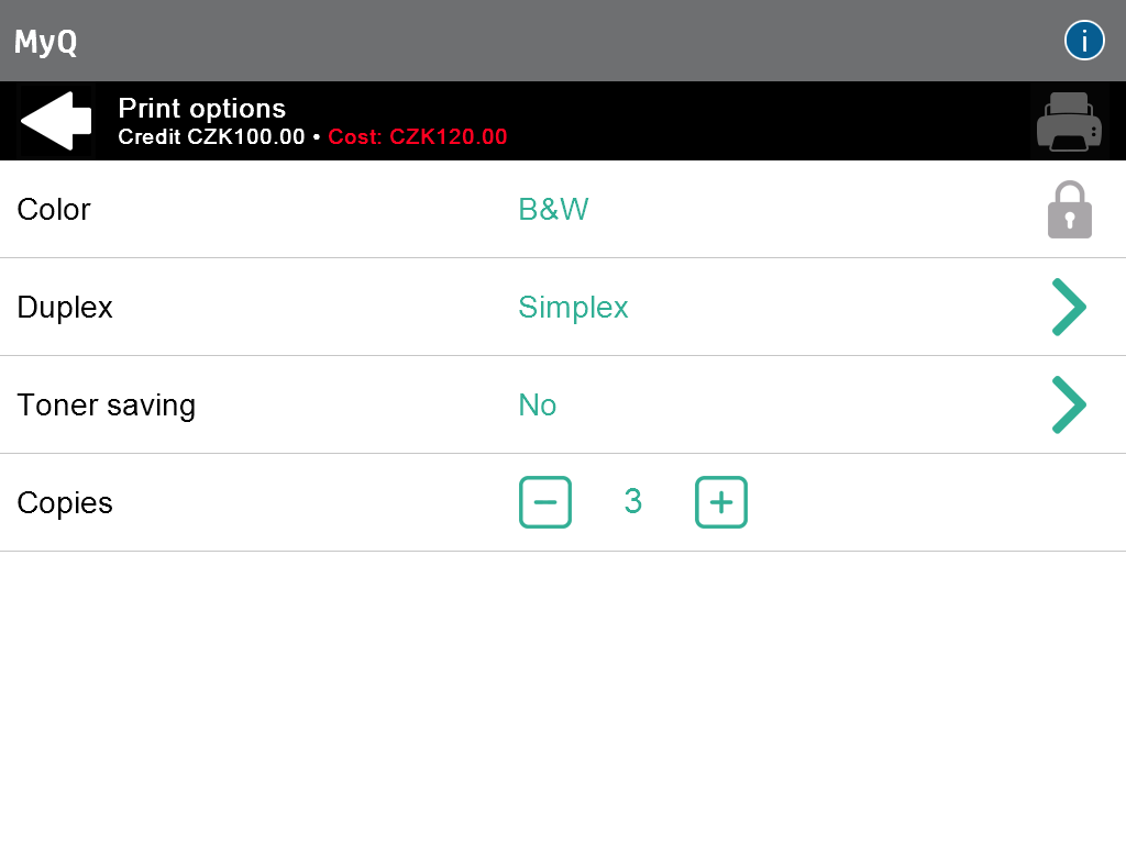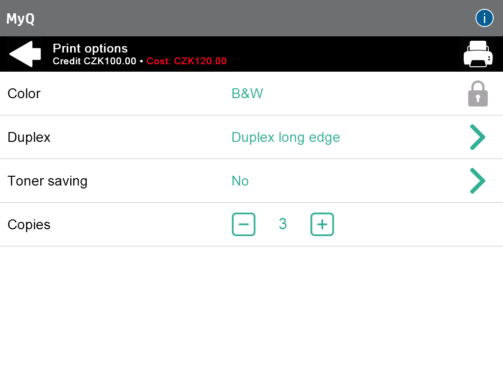 The job’s cost and the current available user's Credit are displayed in the header of the Print options screen. The job cost changes itself dynamically according to options selected in each chargeable print option, using prices set in the price list (including number of copies). The cost updating happens after a change of each value; afterwards, the user is redirected to the Print options screen (except for "Copies". In this case, the price updating happens after each increase/decrease in the number of copies).