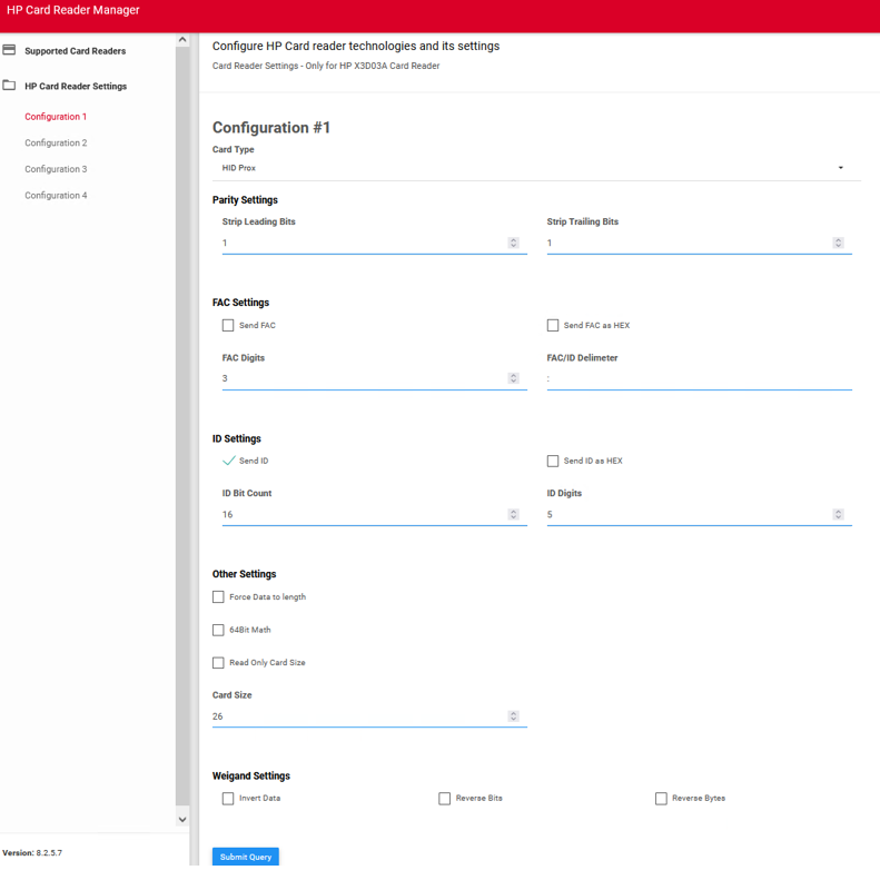 You can configure up to four technologies (Card Settings 1 – 4) for the HP Universal card reader. Each technology can be set on its individual Card Setting tab. After setting the card reader, click Submit Query. Changes are applied immediately; the Remote setup of the HP Embedded terminals is not required. This setting is applied to all HP printing devices equipped with the HP Universal card reader.
