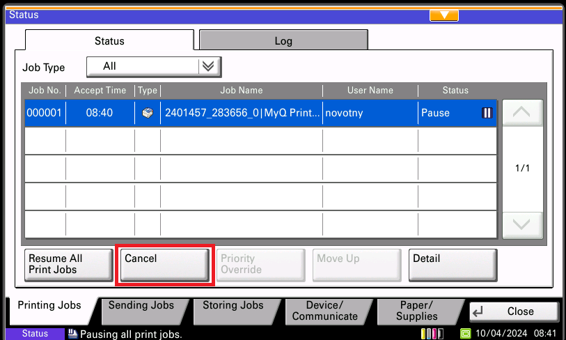 It is possible to cancel all running jobs on the Job Status screen. This is accessed via the status button on the printing device.