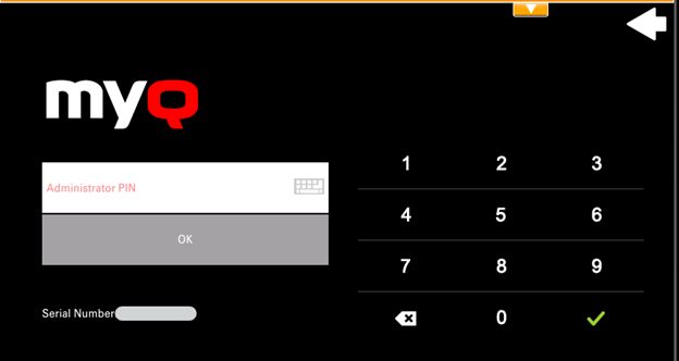 To access the admin menu, tap the MyQ logo in the upper-left corner of the panel and enter the administrator's PIN. The default admin PIN is 1087.