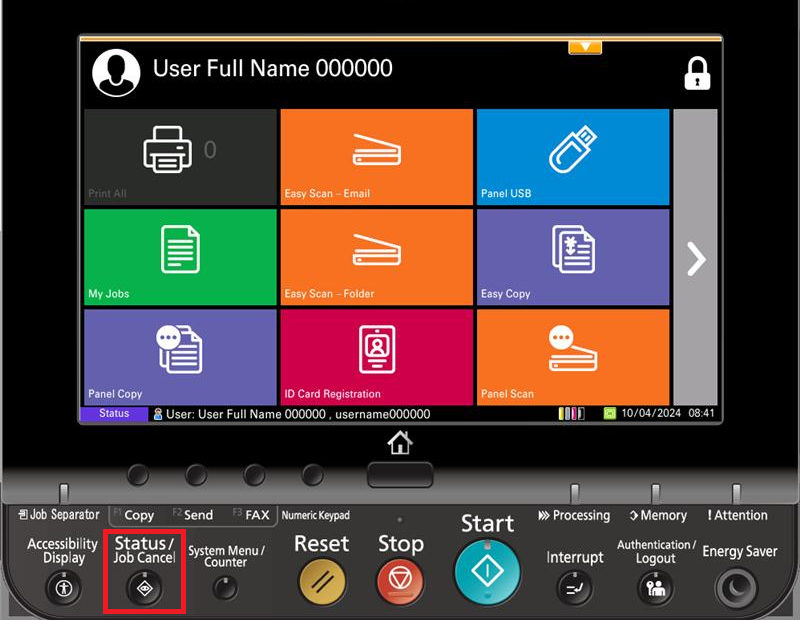 • When a paper jam, out-of-paper, or other error occurs on the device, the user is not automatically logged out until the issue is resolved. The user can still access the MyQ home screen from the system menu and logout using the terminal logout button or by swiping their ID card, in these cases, the action is completed according to each logout method as described above.