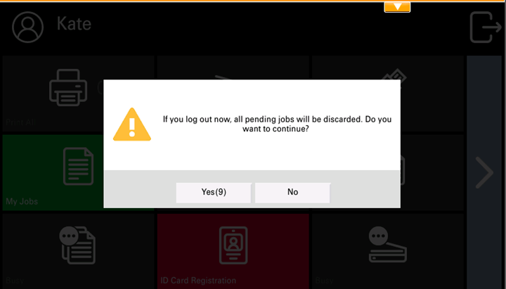 • If there are still active jobs on the device, a special screen is displayed to inform the user about pending logout and allows them to select whether the pending jobs are to be printed or canceled.