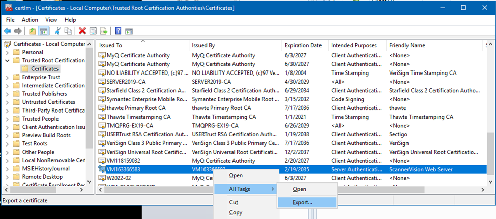 2. Install the exported ScannerVision certificate on the system where the MyQ server is installed.