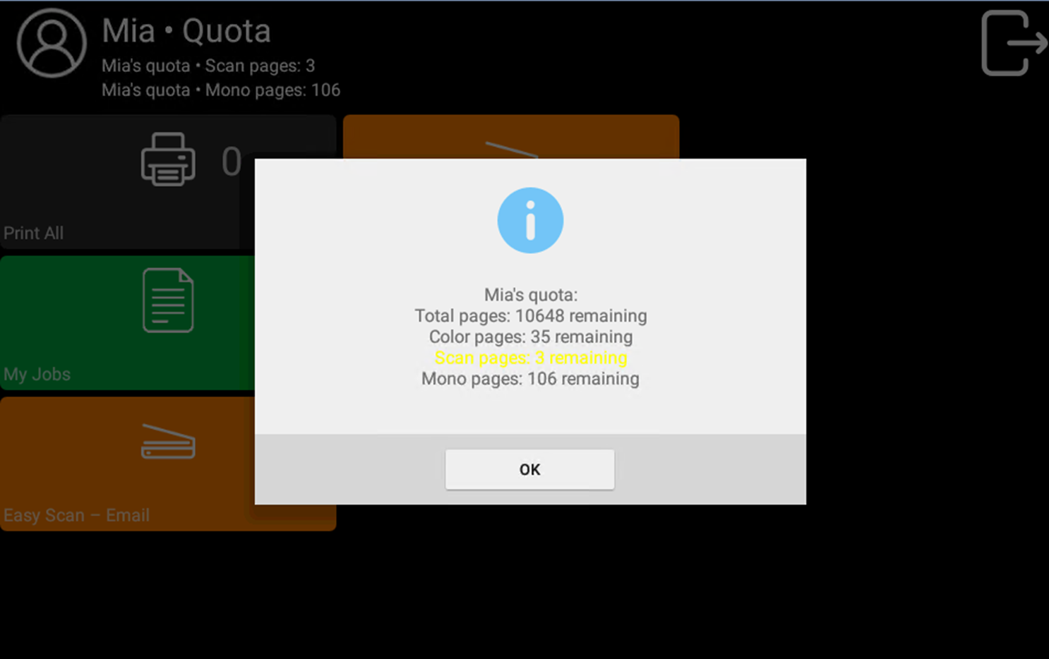 With the Quota feature activated, users cannot print, copy or scan after they reach or exceed their quota limit. They can view their current quotas on their session on the embedded terminal.