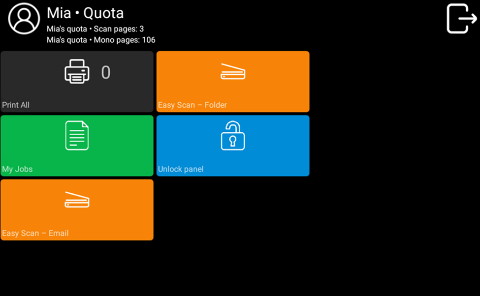 With the Quota feature activated, users cannot print, copy or scan after they reach or exceed their quota limit. They can view their current quotas on their session on the embedded terminal.