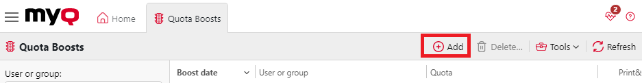 On the MyQ Web Interface, go to MyQ, Quota Boosts. To boost a quota here:
