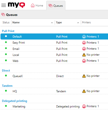 On the Queues main tab, you can see queues and information about them. The queues are divided into groups according to their type: Pull Print, Direct, Tandem, and Delegated printing.