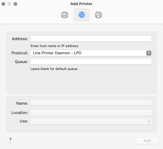 In the Address field, add the IP address or hostname of the localhost. In the Queue field, add a queue name according to the MyQ server setting. Add a Name, and optionally a Location for your printer. In the Use field, select a printer driver from the list. Click Add to setup the printer.