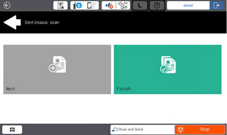 Continuous scan - With the continuous scan option Enabled, scan jobs are not sent until Finish is tapped. After clicking Next, the printing device scans another page. This parameter only works when scanning from the glass panel. It doesn’t work when using the Automatic Document Feeder.