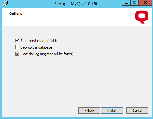 The MyQ update to a higher version or reinstalling the same version is performed automatically after running the installation executable file.