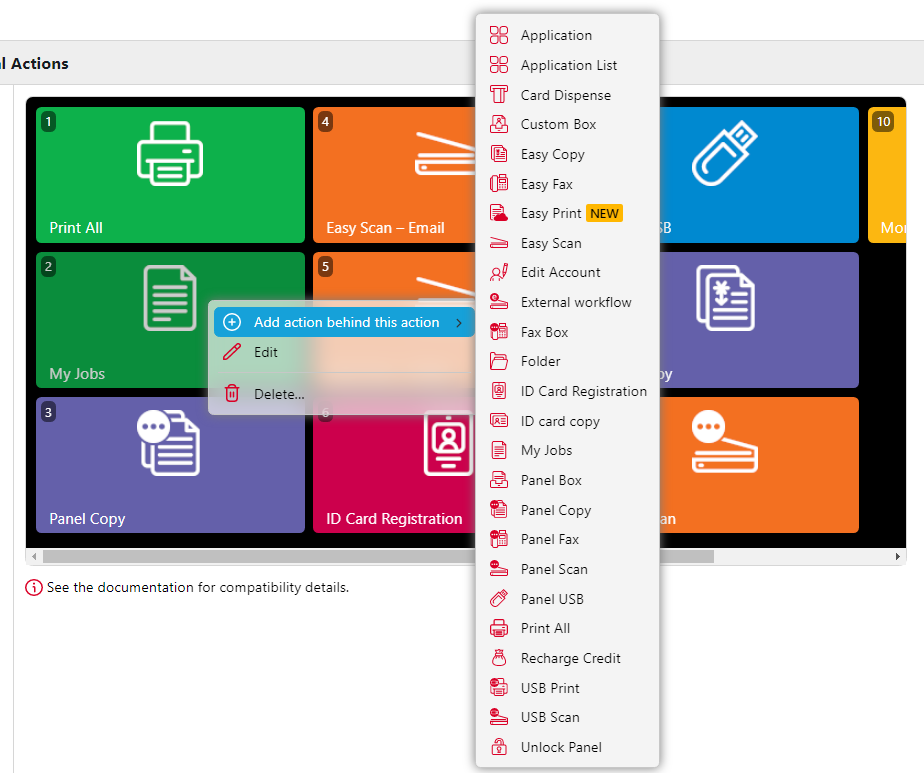 Terminal action nodes can be managed on the Terminal Actions settings tab (MyQ, Settings, Terminal Actions). They can be managed either under Home screen on the list of actions or directly on the terminal screen preview.