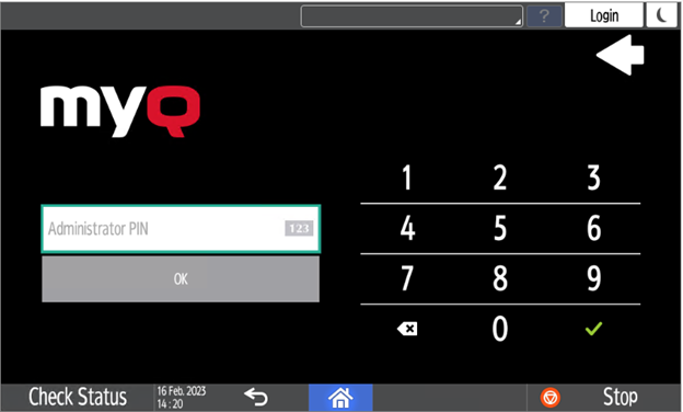On the initial screen of the MyQ Embedded application, tap the MyQ logo to open the admin login screen.