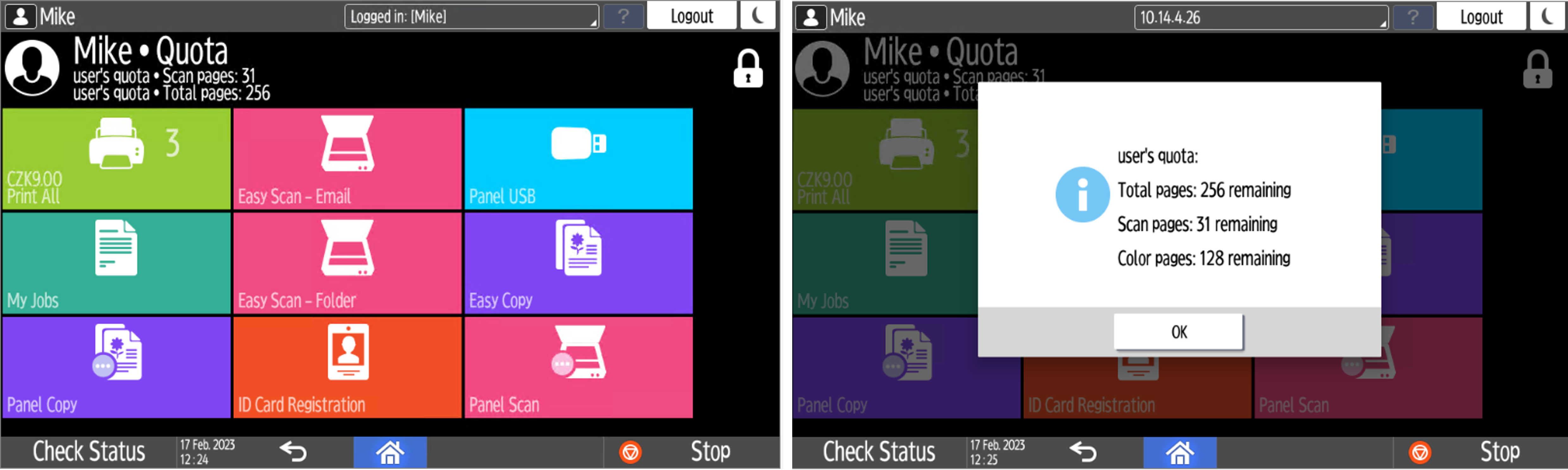 With the Quota feature activated, users cannot print, copy or scan after they reach or exceed their quota limit. They can view their current quotas on their session on the embedded terminal.