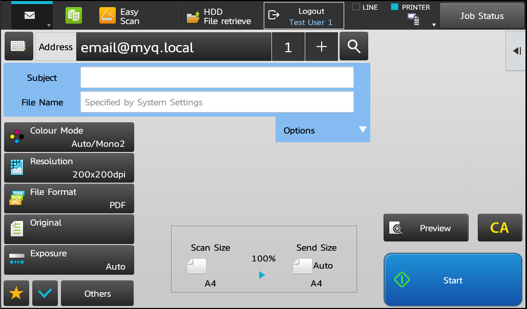 Sending scans to the user's primary email - The scanned document is sent to the user email set in the email text box on the user properties panel. The receiver email address has to be email@myq.local.