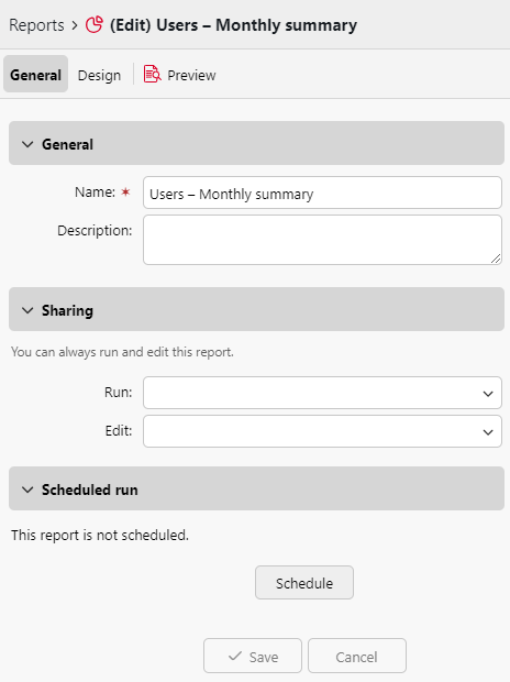 On the General tab of the report's editing tab, you can change the report's Name, add a Description, and select Sharing rights (the users or groups who will have the rights to Run the report and those who will have the rights to Edit the report).
