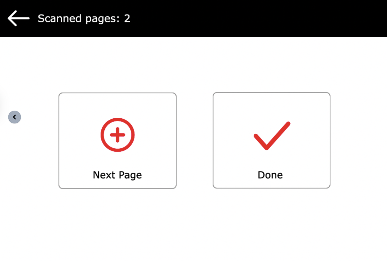 Continuous scan - With the continuous scan option Enabled, scan jobs are not sent until Done is tapped. After clicking Scan, the printing device offers another page with Next Page or Done. You can select from the following: