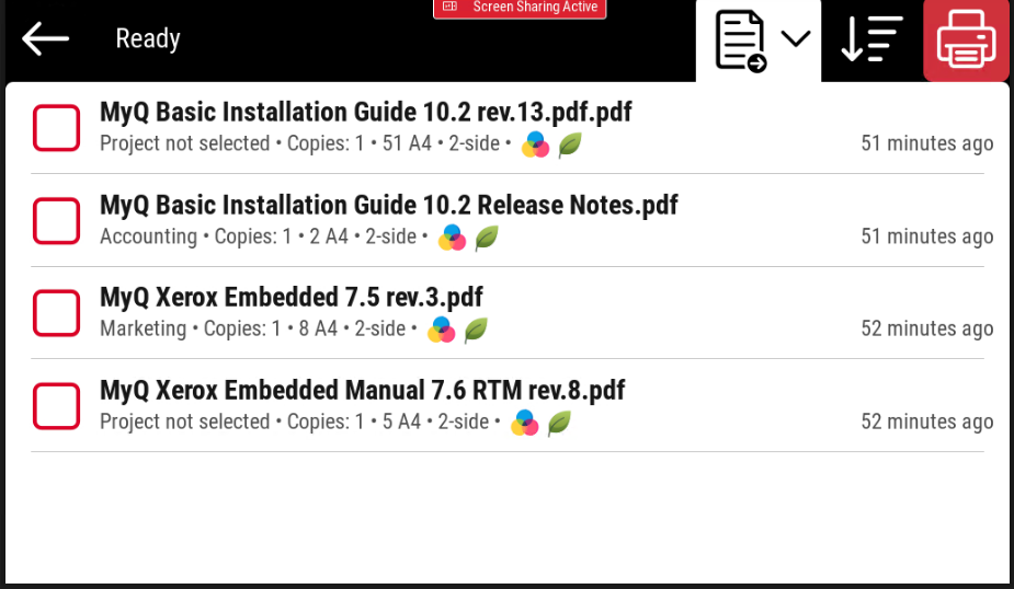 If all the jobs waiting in queue have projects already assigned by MyQ Desktop Client, MyQ Web administrator interface or the MyQ mobile application, printing starts immediately.