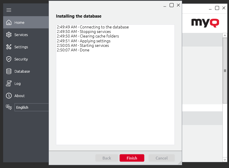 Haga clic en Acabado para salir del Asistente de MyQ Database.