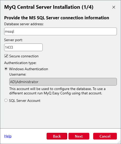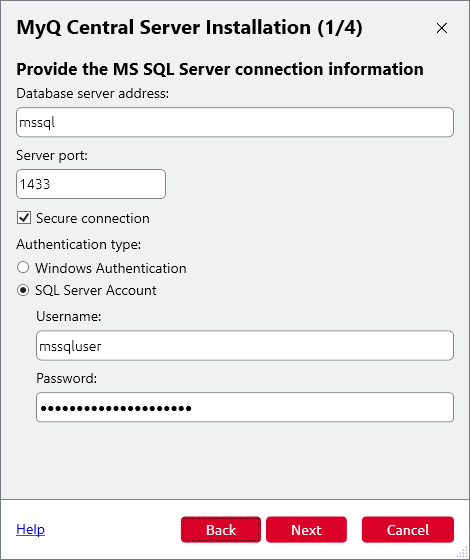 Nombre de usuario/contraseña: Credenciales de inicio de sesión para acceder a la gestión de la base de datos MS SQL. La cuenta de inicio de sesión debe tener el público rol de servidor fijo para acceder a la base de datos MS SQL. También puede utilizar Autenticación de Windows.
