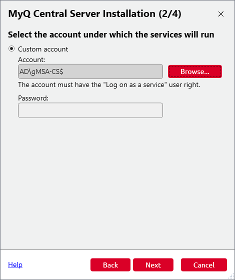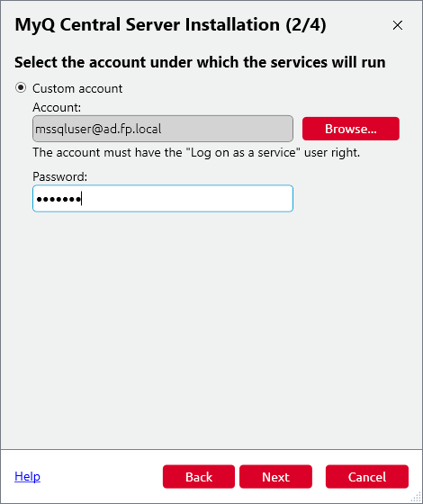 Seleccione la cuenta con la que se ejecutarán los servicios. Esta cuenta debe tener el Conectarse como servicio derecho del usuario.