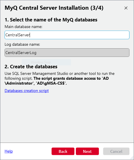 Rellene el Nombre de la base de datos principal (nombre de la nueva base de datos MS SQL de MyQ, por ejemplo Base de datos MyQDatabase), el Nombre de la base de datos de registro se rellena automáticamente de acuerdo con el nombre de la base de datos y ejecuta el comando Script de creación de bases de datos.