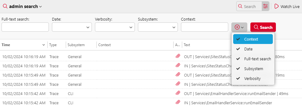 También puede configurar el registro para que muestre sólo los mensajes que informan sobre subsistemas MyQ específicos, como la Web UI, la configuración de impresoras remotas, las sesiones de usuario en terminales MyQ, y también sobre un contexto específico, por ejemplo, la impresión directa o un dispositivo de impresión específico.