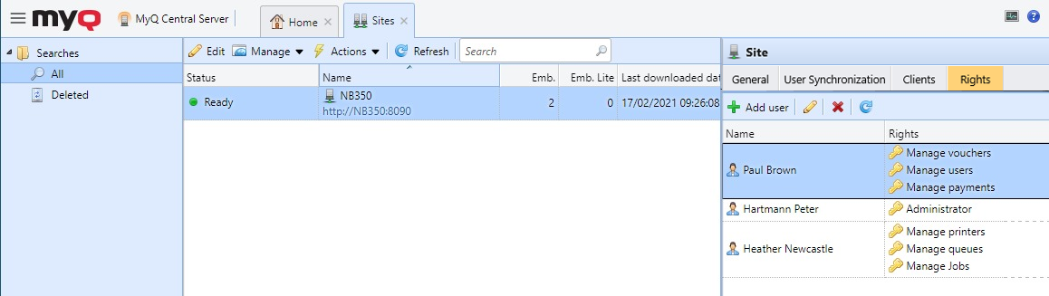 Para gestionar los derechos de un servidor de sitio en el Servidor Central, vaya a MyQ, Sitios seleccione el servidor del sitio y haga clic en Editar en la cinta principal (o haciendo doble clic o clic con el botón derecho y seleccionando Editar en el servidor del Sitio). El panel de propiedades del servidor del sitio se abre en el lado derecho. Vaya a la sección Derechos haga clic en Añadir usuario para seleccionar el usuario (o grupo de usuarios), y luego asignarles derechos.