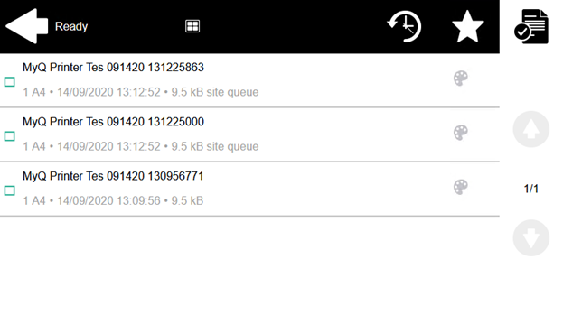Trabajos listos: Esta es la pestaña inicial del Mis trabajos pantalla. Se puede reabrir tocando el icono de la página en la esquina superior izquierda de la pantalla. Contiene trabajos en cola, listos para ser impresos.