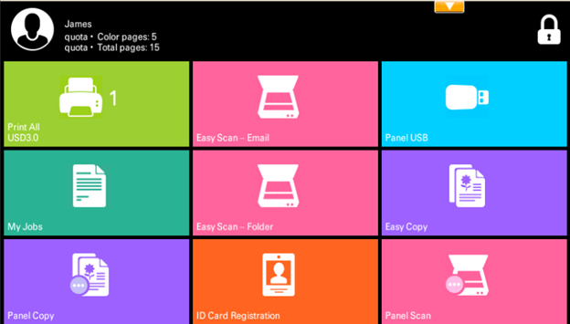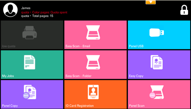 El comportamiento del terminal incrustado depende de la configuración de cuotas en MyQ. Al configurar Cuota en la interfaz del administrador de MyQ Web, puede desactivar una o varias operaciones una vez que se haya alcanzado o superado la cuota: