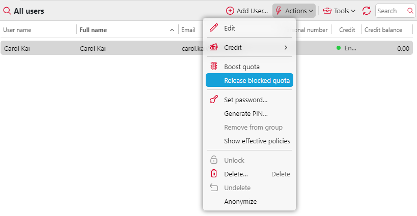 El administrador también puede liberar la cuota bloqueada de un usuario haciendo clic en Acciones y luego haciendo clic en Liberar cuota bloqueada (o haciendo clic con el botón derecho del ratón sobre el usuario y seleccionando Liberar cuota bloqueada).
